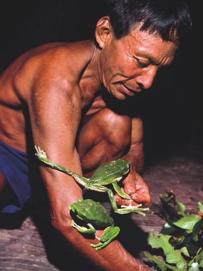 De Kaxinawá-legende vertelt dat de indianen van de stam erg ziek waren en dat hun medicijnman, de Pajè, alles had gedaan wat mogelijk was om hen te genezen. Alle bekende medicinale kruiden werden gebruikt maar geen enkele hielp. Onder invloed van heilige plantaardige medicijnen ging hij het bos in en werd daar bezocht door een vrouwelijke geest van het bos. Ze bracht een kikker in haar handen waaruit ze een witte secretie nam en leerde de Pajé hoe hij dit kon toepassen.